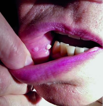 Christine, 50 ans, consulte pour l’apparition progressive en 2 mois de tuméfactions jugales gênantes « comme une dent molle dans la joue », qui résistent aux bains de bouche. Les tentatives d’exérèse spontanée entraînent un mâchonnement avec tic de succion.