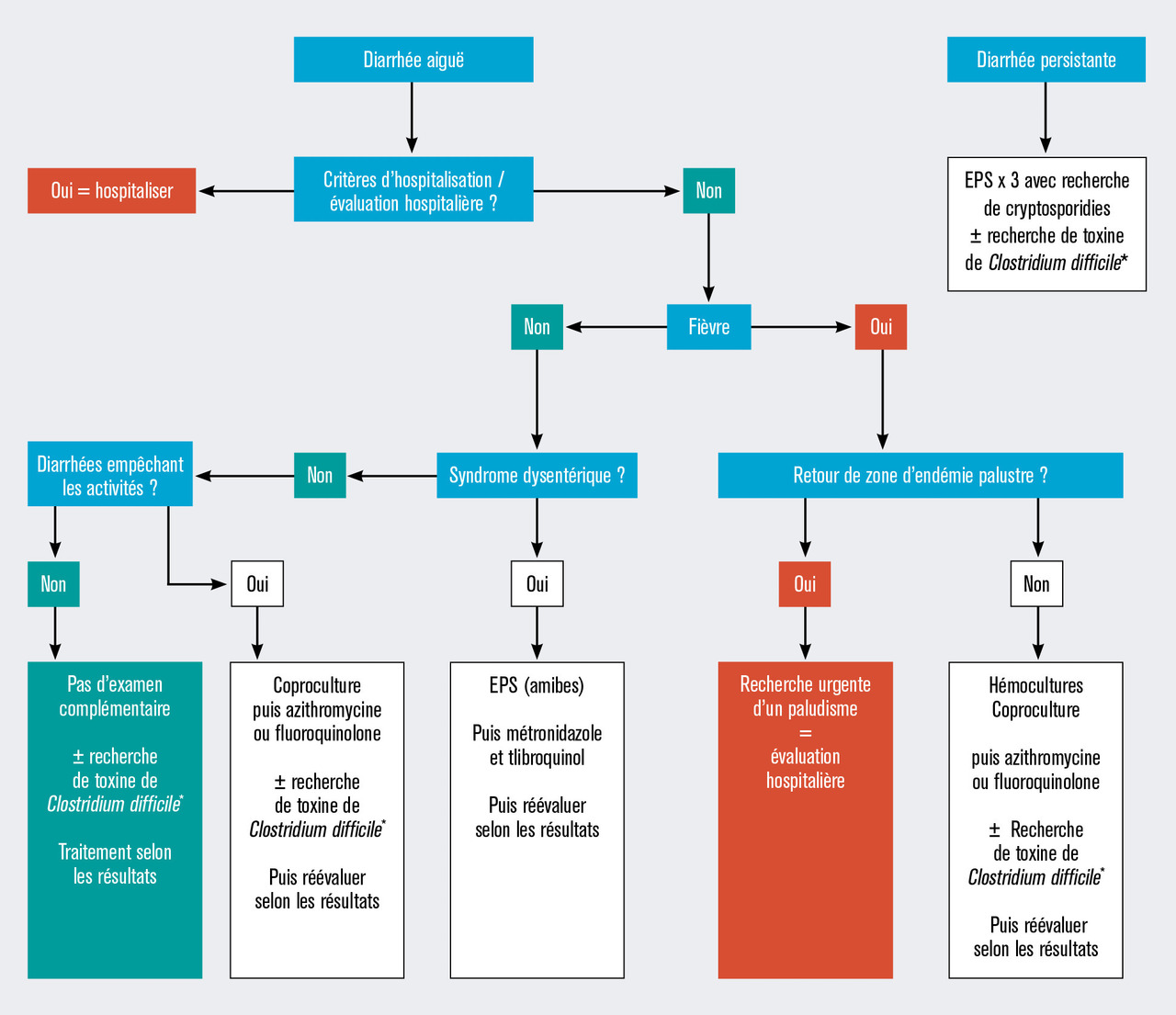 La figure ci-contre résume l’algorithme de prise en charge en première intention d’une diarrhée du voyageur.