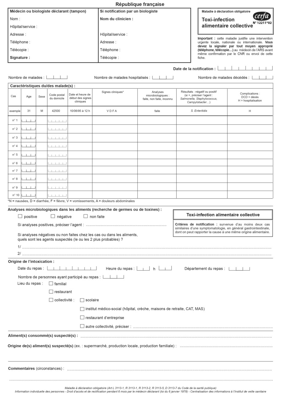 Les TIAC font partie des maladies à déclaration obligatoire (art. 3113-1 du code de la santé publique) (tableau 7) .