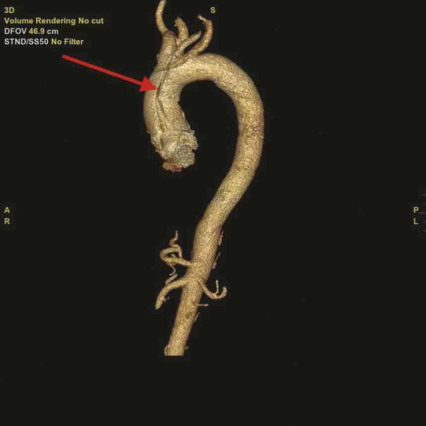 Cet homme de 55 ans, sans antécédent, avait appelé le 15 pour une douleur thoracique irradiant dans la mâchoire et des paresthésies du bras droit, après un effort de marche. À l’examen la pression artérielle était de 165/85 mmHg symétrique, les pouls étaient symétriques, et il n’y avait pas de déficit moteur des 4 membres. L’électrocardiogramme montrait un léger sous-décalage du segment ST en DIII et AvF. Le médecin du SMUR retenait le diagnostic de syndrome coronaire aigu « non ST+ » et orientait le patient vers une unité de soins intensifs cardiologiques où la tomodensitométrie thoracique (fig. 1) révélait finalement une dissection aortique de type A étendue de la racine de l’aorte jusqu’à l’ostium de l’artère carotide primitive gauche (fig. 2).