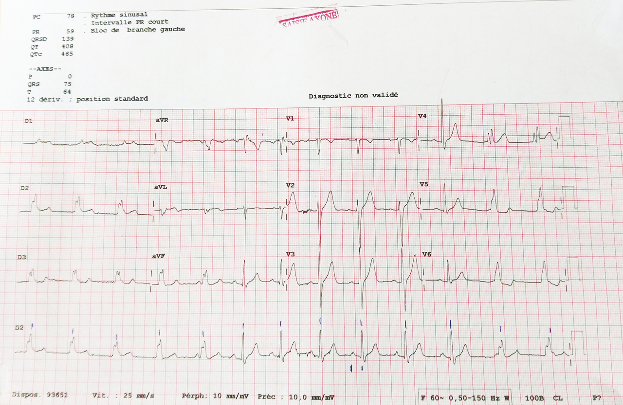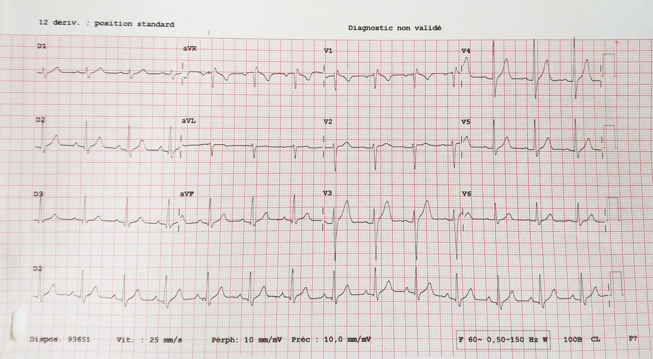Un militaire de 22 ans consulte pour sa visite médicale périodique. L’électrocardiogramme (ECG) alors réalisé montre un élargissement du QRS avec raccourcissement de l’intervalle PR de manière intermittente (