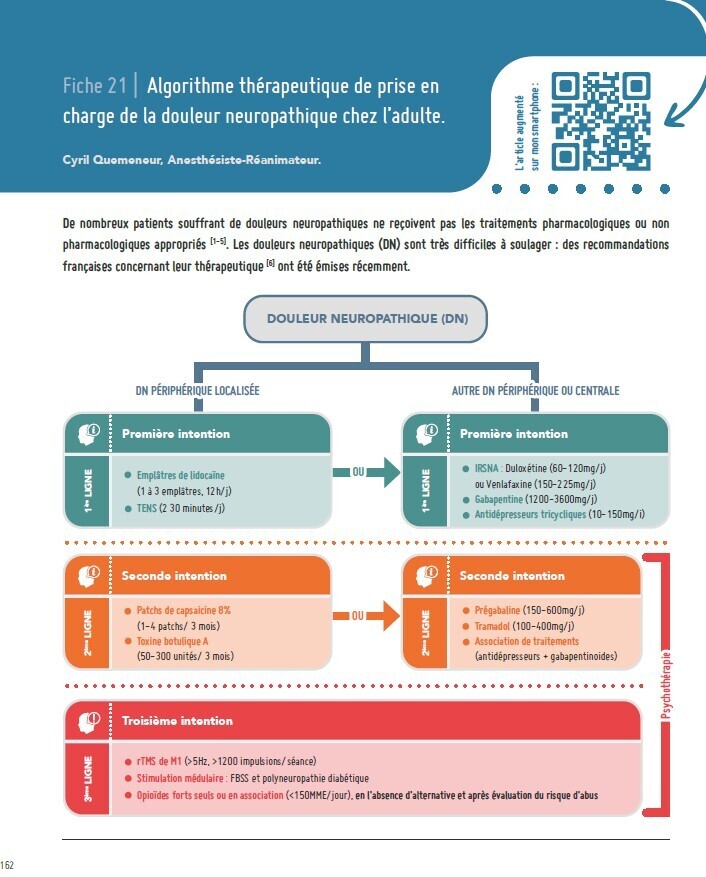 Pour améliorer les pratiques, la SFAR et la SFETD ont édité un Livre blanc de la douleur avec des fiches pratiques dont un algorithme de prise en charge de la douleur neuropathique chez l’adulte (fiche 21 – Algorithme thérapeutique de prise en charge de la douleur neuropathique chez l’adulte).