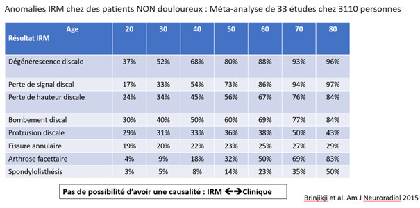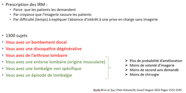 Tout d’abord, lors de la prescription, il faudrait prévenir le patient que l’examen trouvera probablement des anomalies qui n’ont pas de lien avec la douleur.