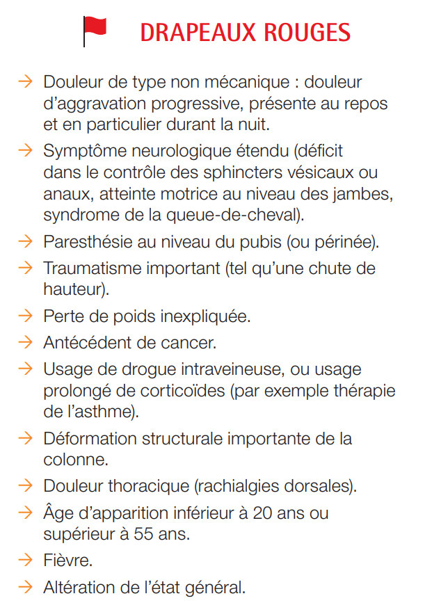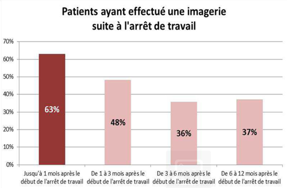 Oui, les études le montrent. Par exemple, parmi les personnes en arrêt de travail depuis 6 mois pour lombalgie, deux tiers ont déjà fait un examen dans le 1er mois, et la moitié entre le 1er et le 3e mois (fig. 1). Pourtant, les recos françaises sur la lombalgie ne recommandent pas d’imagerie avant 3 mois… et les Anglais recommandent de ne pas faire du tout d’examen ! Bien sûr, l’imagerie doit être prescrite devant des signes d’alerte (les « drapeaux rouges », fig. 2) qui représentent 1 % des cas, ou une sciatique (5 à 10 % des consultations). Mais il reste 90 % des situations où l’on ne devrait pas prescrire d’examen à la phase initiale…