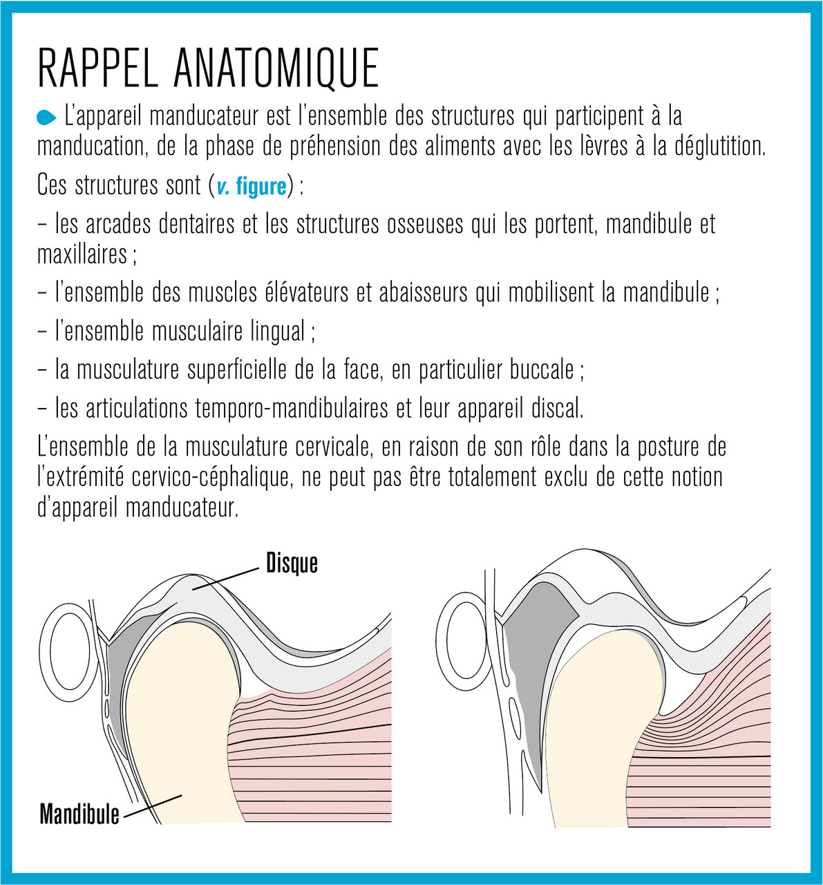 Le terme de dysfonction de l’appareil manducateur1 répond à de nombreuses autres appellations telles que le syndrome algo-dysfonctionnel de l’appareil manducateur, ou syndrome de Costen, ou désordre temporo-mandibulaire par exemple.