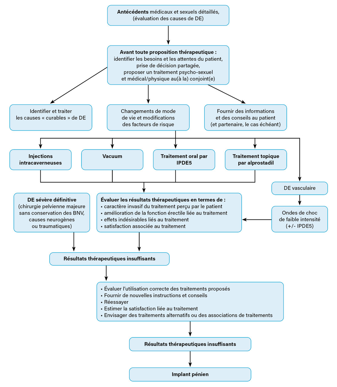 Les modalités de traitement de la dysfonction érectile comprennent les iPDE5 couramment utilisés,16 les injections intracaverneuses, les crèmes intra-urétrales, les traitements physiques, notamment les dispositifs d’érection par pompe à vide (vacuum) ou par système de traction pénienne, et les implants péniens ; ces outils thérapeutiques pourraient avoir des avantages sur la préservation érectile et de la longueur du pénis.17 L’approche du traitement doit être personnalisée : les besoins et attentes des patients doivent être entendues et ils doivent être informés en détail de l’efficacité, des risques et des résultats attendus de l’utilisation de ces outils thérapeutiques (fig. 1 ).