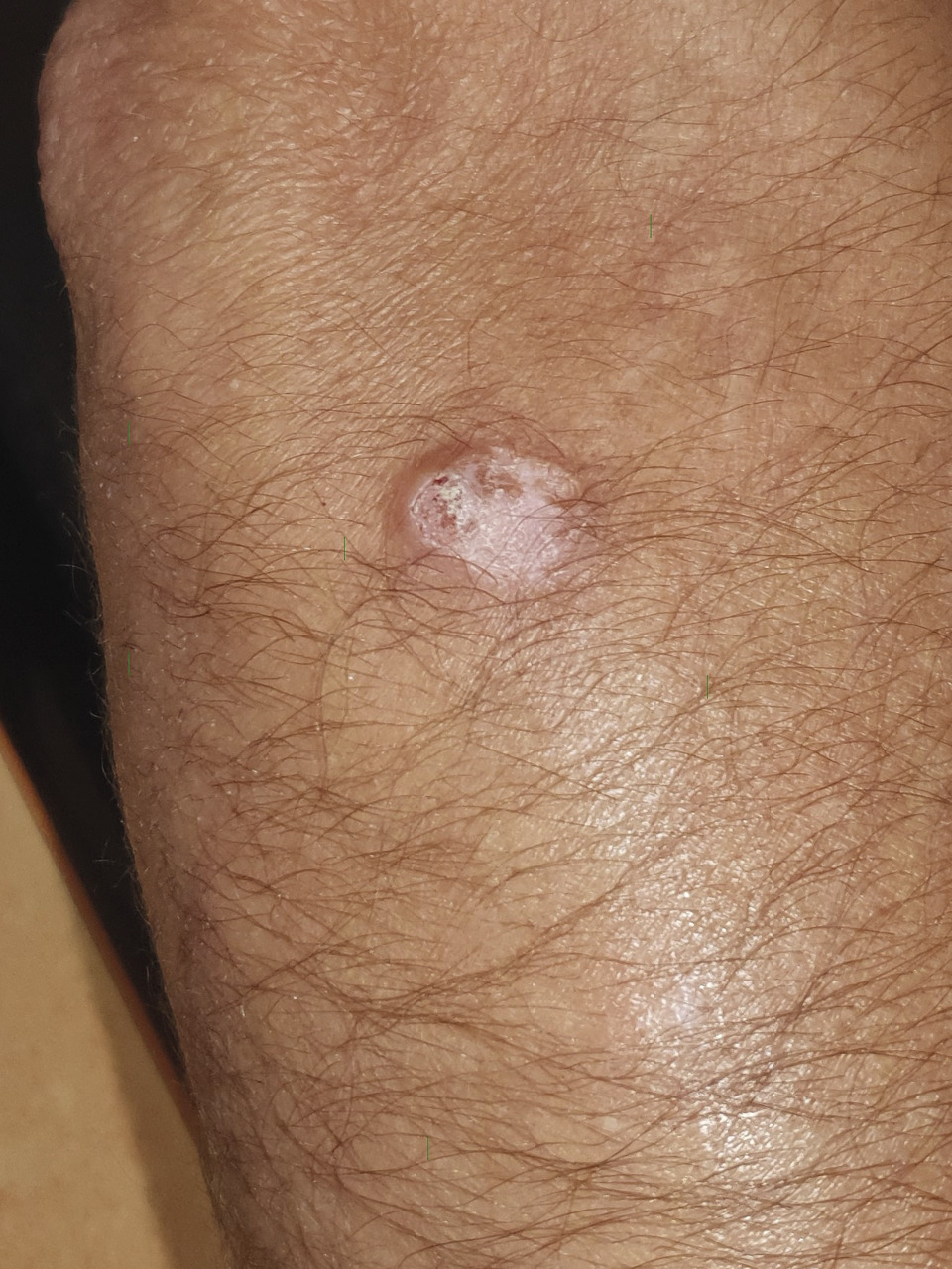 Sébastien, 45 ans, consulte pour une lésion exophytique irrégulière au niveau du bras droit, apparue il y a plusieurs années déjà, et s’étendant progressivement (
