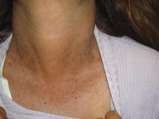 Elle se manifeste par des papules cornées sèches, de couleur brun jaunâtre, pouvant confluer pour former des plaques verruqueuses, d’aspect sale. Elles sont volontiers infectées, malodorantes (due à une prolifération bactérienne) et responsables d’un inconfort sévère. Elles évoluent par poussées et sont aggravées par l’exposition au soleil (ou aux UVB), la chaleur, la sudation.