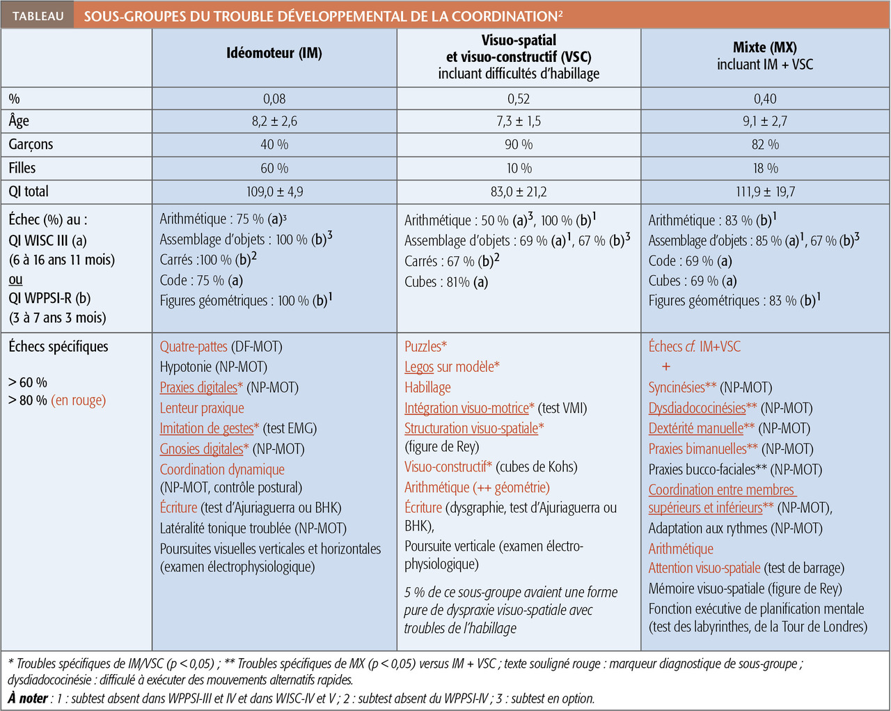 Il renseigne sur la nature des troubles (éventuels signes neurologiques mineurs), révèle un déficit moteur et des troubles spécifiques significatifs, véritables marqueurs diagnostiques des sous-groupes cliniques du TDC (soulignés dans le tableau).