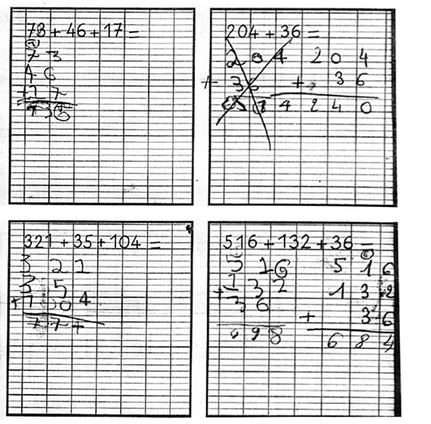 Des troubles visuo-moteurs de l’organisation spatiale apparaissent lorsqu’il faut comparer des signes orientés sur des schémas ou des tableaux, se repérer dans des figures géométriques ou les reproduire, poser des additions (figure), mais il ne s’agit pas d’une dyscalculie.