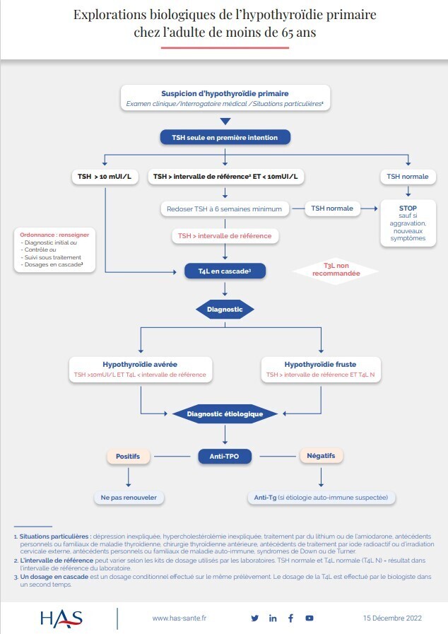 Quel que soit le profil du patient, si plusieurs symptômes font suspecter une hypothyroïdie, la HAS recommande de réaliser des analyses biologiques de manière séquencée, selon un procédé « en cascade » (cf. arbre décisionnel en fig. 1) : le médecin établit une seule et même ordonnance dans laquelle il liste les différents dosages utiles, à commencer par celui de la TSH. Un seul prélèvement sanguin est réalisé, le biologiste n’enclenchant les dosages complémentaires que si le résultat de la TSH est d’emblée anormal (ou confirmé anormal après quelques semaines). Si la TSH est anormale, le laboratoire dosera la T4L pour distinguer une hypothyroïdie avérée (TSH > 10 mUI/L et T4L < l’intervalle de référence du laboratoire) d’une hypothyroïdie fruste (forme pauci- ou asymptomatique ; TSH > l’intervalle de référence du laboratoire sur au moins 2 prélèvements à 6 semaines d’intervalle minimum et T4L dans l’intervalle de référence du laboratoire). Le dosage des anticorps anti-TPO (thyropéroxydase) n’est pas systématique ; il est utile pour rechercher une origine auto-immune de la maladie (par exemple, une maladie de Hashimoto). De même, l’échographie n’est pas indiquée sauf dans des indications précises :