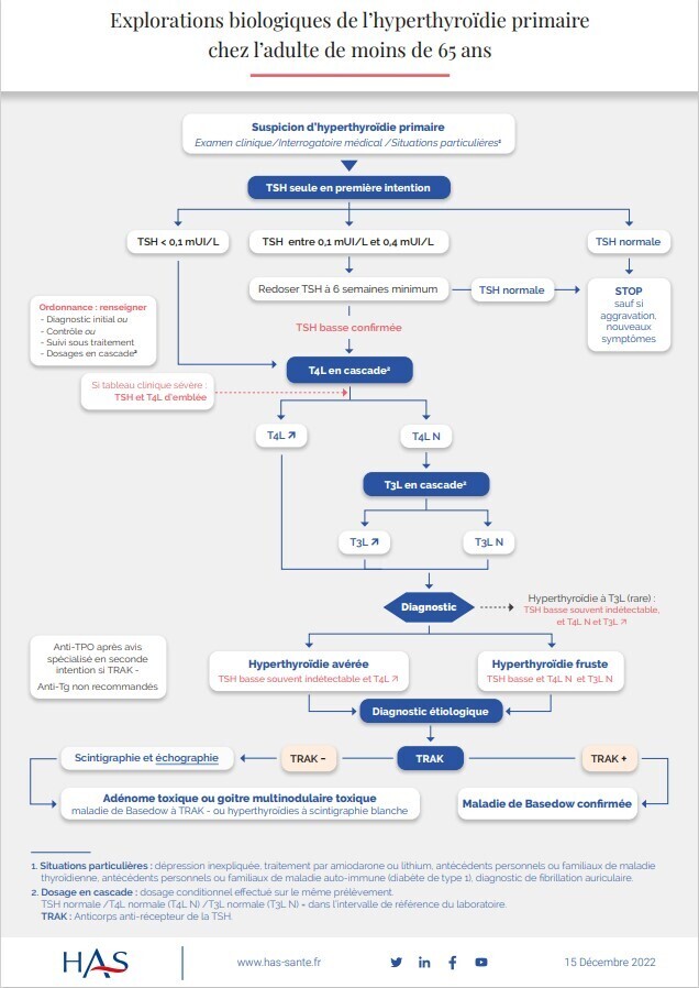 Face à des symptômes évocateurs d’hyperthyroïdie (palpitations, nervosité, irritabilité…), la confirmation du diagnostic repose en première intention sur le seul dosage de la TSH. D’autres examens biologiques peuvent être effectués en cascade (cf. arbre décisionnel en fig. 1), à partir d’une même ordonnance et d’un même prélèvement sanguin, lorsque le résultat est anormal, pour compléter le diagnostic (hyperthyroïdie fruste : TSH abaissée, T4L et T3L dans l’intervalle de référence du laboratoire ; avérée : TSH basse souvent indétectable, T4L élevée) et déterminer la cause de la maladie (maladie de Basedow, adénome toxique…), selon l’arbre décisionnel en figure 5. Ainsi, il est fortement recommandé de prescrire et de doser TSH + T4L +/- T3L en cascade.