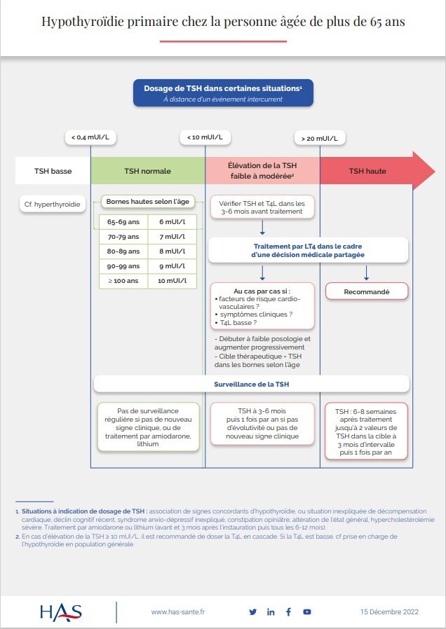 Dosage de la TSH uniquement en cas de signes d’appel : symptômes évocateurs, découverte d’un déclin cognitif récent, aggravation des troubles neurocognitifs connus de manière inexpliquée, traitement par amiodarone. Pour interpréter le résultat : adapter la valeur haute de référence de la TSH à l’âge des personnes (égale à la décennie d’âge du patient à partir de 60 ans : par exemple, 8 mUI/L pour les sujets de 80 à 89 ans). Si un traitement par lévothyroxine est nécessaire, celui-ci doit débuter à une faible posologie (cf. arbre décisionnel en fig. 3)