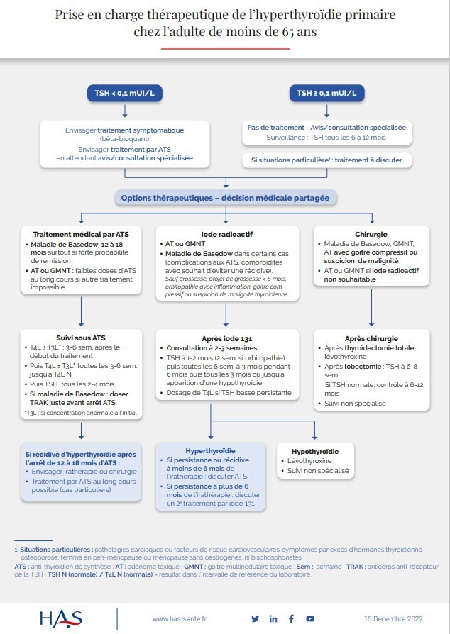 Adresser à l’endocrinologue (avec une biologie de moins de 3 mois) si : hyperthyroïdie avérée ou fruste persistante ; hyperthyroïdie chez une femme ayant un projet de grossesse ou enceinte ; indication de traitement radical (irathérapie ou thyroïdectomie).