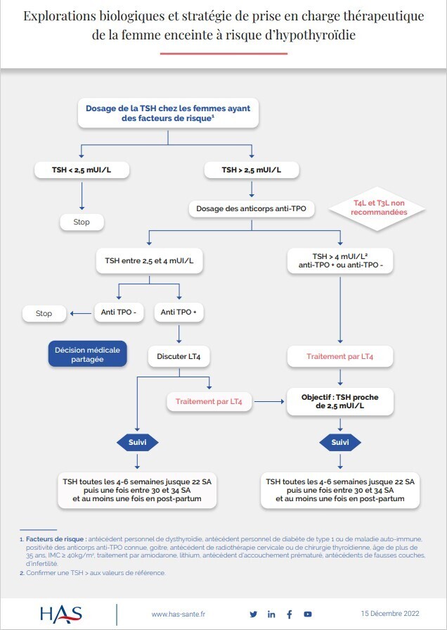 Le dépistage ciblé de la TSH en période préconceptionnelle ou en début de grossesse est recommandé chez les femmes ayant un risque d’hypothyroïdie (antécédents familiaux de dysthyroïdies, maladies auto-immunes…), ou rencontrant des difficultés de procréation (infertilité, fausses couches…) ou encore en parcours de PMA, avec le dosage de la TSH seule (cf. arbre décisionnel en fig. 4). Les valeurs seuils doivent être adaptées en fonction du trimestre de grossesse. En cas d’hypothyroïdie diagnostiquée en début de grossesse, la monothérapie par la lévothyroxine est la référence (la liothyronine est contre-indiquée).