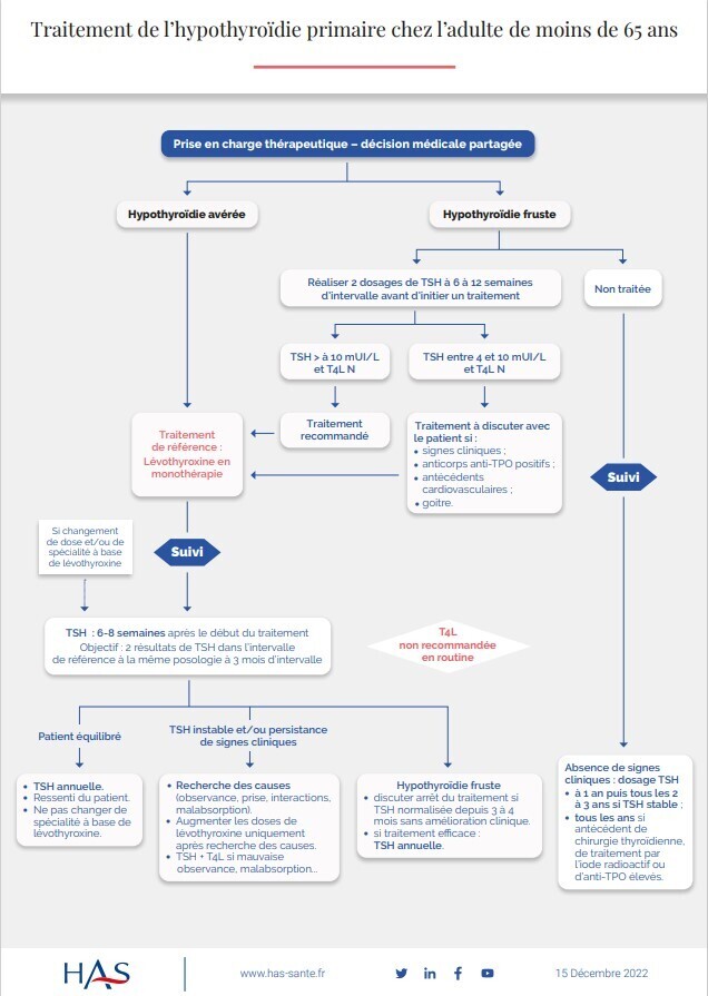 Une consultation avec un endocrinologue est recommandée si : patient non équilibré, antécédent de cardiopathie ischémique, présence d’un nodule, d’un goitre, grossesse ou désir de grossesse.