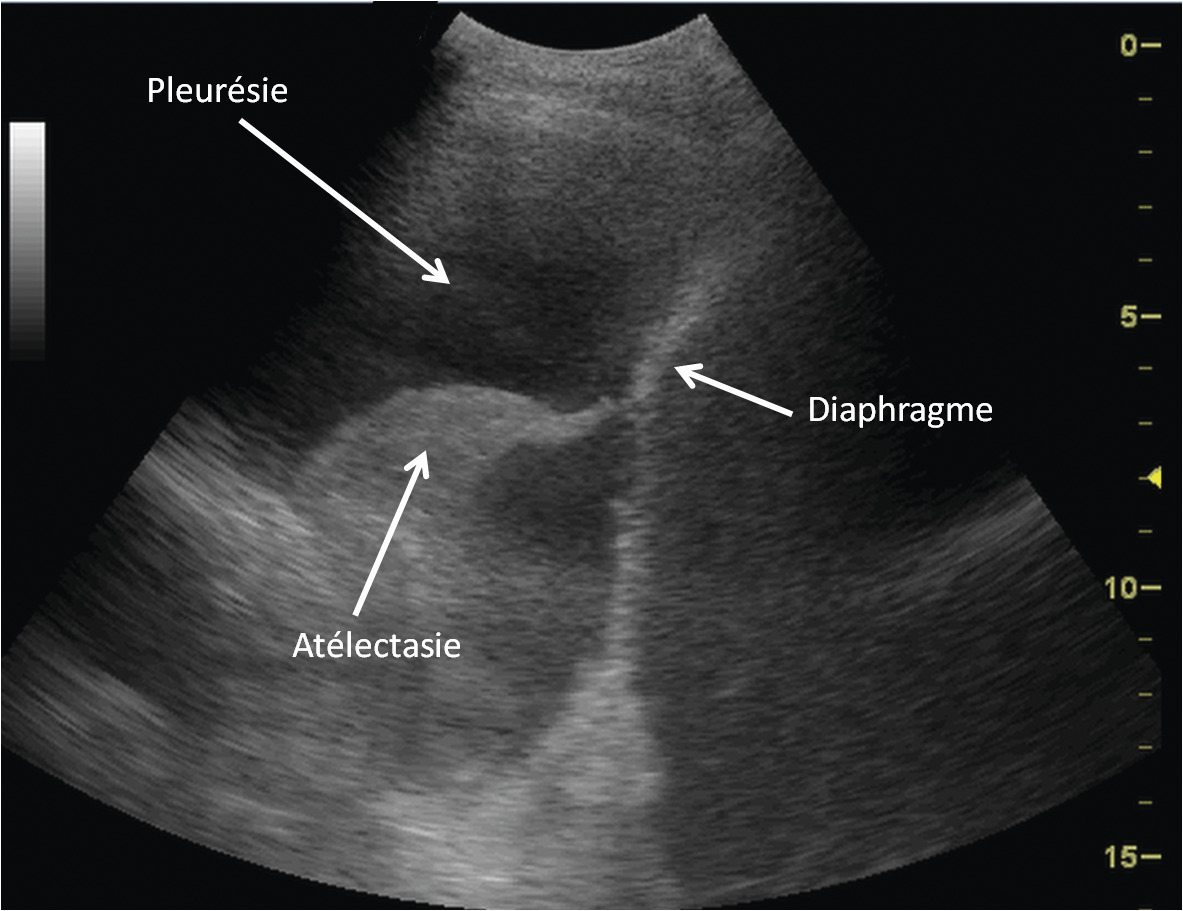 L’échographie est mieux adaptée que la radiographie thoracique pour le diagnostic des pleurésies, en particulier parapneumoniques. Elle permet un suivi évolutif en évaluant de manière plus précise l’abondance de la pleurésie (fig. 1 ).