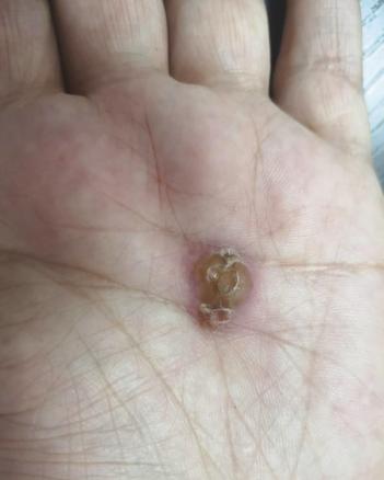 Cette patiente de 54 ans consultait pour une lésion cutanée palmaire gauche évoluant depuis 2 semaines après un traumatisme par un couteau lors de la manipulation d’une tête de mouton. À l’examen clinique, on notait au niveau de la face palmaire de la main gauche la présence d’une lésion nodulaire, hyperpigmentée, à bordure inflammatoire, de 1,5 cm de grand axe. La base était légèrement indurée, la surface propre et le centre ulcéré en pseudo-cocarde (figure ) ; la lésion était légèrement douloureuse et non prurigineuse. Il n’y avait pas d’autres lésions cutanées ou extracutanées. Aucun examen complémentaire n’était effectué. L’évolution, après désinfection par des antiseptiques locaux, était marquée par une très nette amélioration avec disparition totale de la lésion au bout de 2 semaines.
