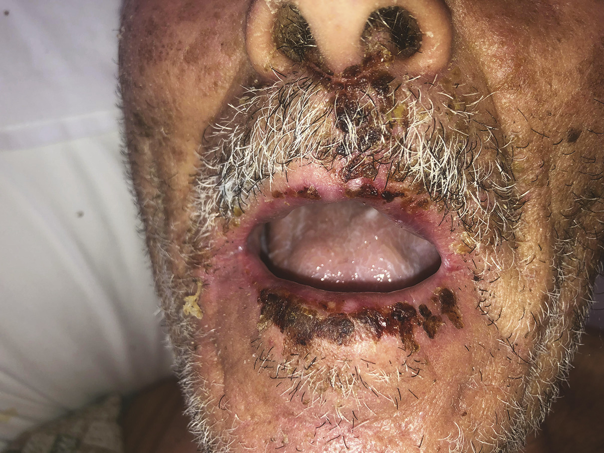 Ce patient de 68 ans était admis aux urgences pour des lésions cutanées érosives douloureuses et symétriques des extrémités et de la région fessière, associées à une atteinte muqueuse faite d’une chéilite fumigène (fig. 1 ) avec un énanthème de la muqueuse buccale et une pharyngite évoluant depuis 2 semaines associés à des érosions péniennes (fig. 2 ) et scrotales suintantes avec issue de pus et conjonctivite bilatérale. Un herpès labial était apparu 20 jours avant son admission. La biopsie cutanée montrait dans le derme un infiltrat inflammatoire et des cavités épidermiques remplies de sérosités avec des cellules inflammatoires et hémorragiques. Le diagnostic d’érythème polymorphe était retenu. Le patient était traité par valaciclovir 1 g par jour pendant 2 semaines, permettant une cicatrisation complète des lésions en 10 jours.