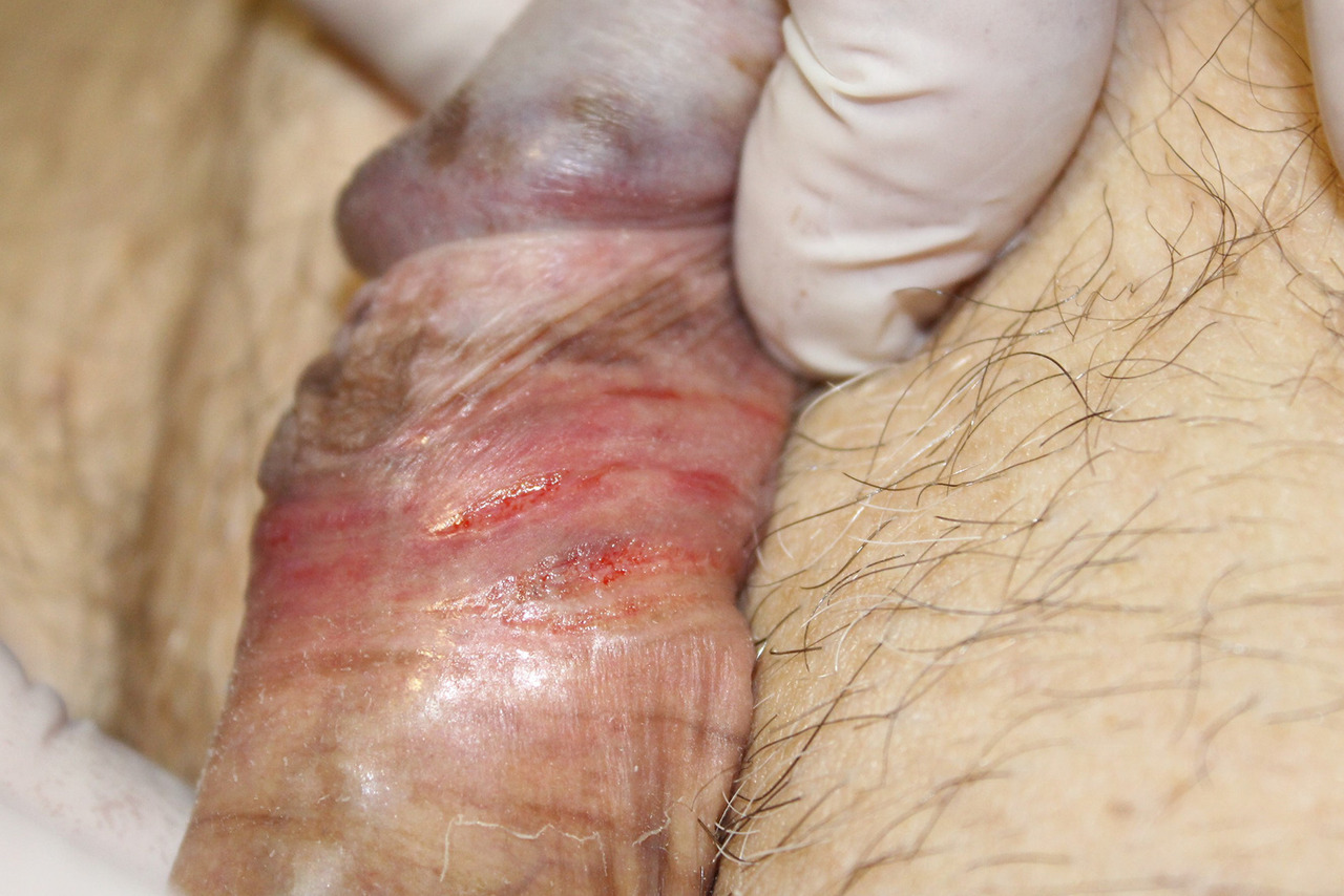 L’atteinte du pénis peut être secondaire à l’utilisation d’accessoires sexuels, de préservatifs au latex (cas de ce patient), de gels et savons parfumés.