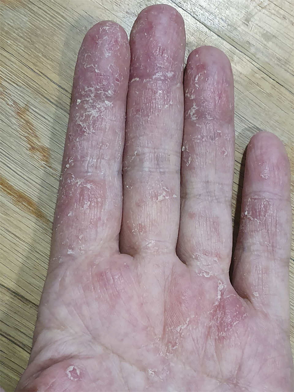 Monique, 39 ans, commerçante, consulte pour des squames apparues au niveau des mains depuis quelques semaines. Trop précautionneuse, elle applique à la lettre les mesures barrières anticoronavirus et se frictionne avec du gel hydroalcoolique plus de 100 fois par jour...