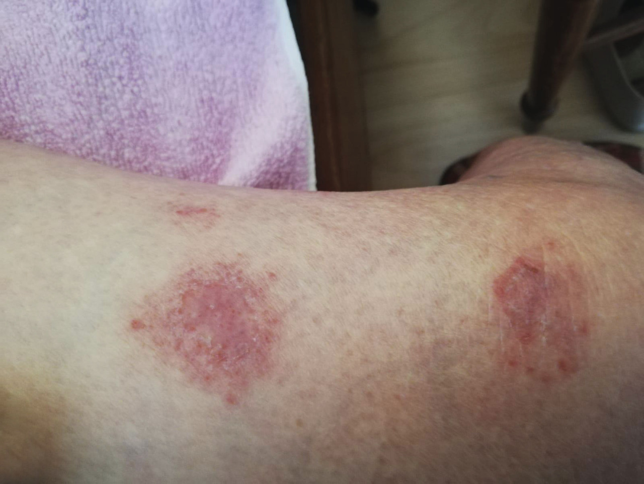 Cette patiente de 89 ans consulte pour une éruption cutanée des membres. Les lésions sont discoïdes, de 1 à 4 cm de diamètre et légèrement prurigineuses. Leur apparition a été progressive depuis plusieurs semaines. Un traitement par une corticothérapie locale est prescrit, qui entraîne leur régression, puis leur disparition en quinze jours.