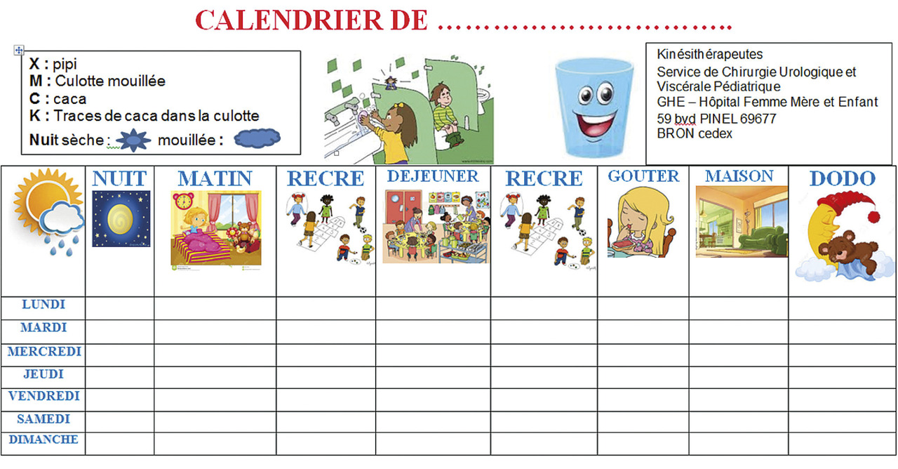 L’enfant est encouragé à se rendre aux toilettes au moins 6 fois par jour (toutes les 3 heures) en profitant des pauses de la journée (figure ). Il doit se placer confortablement sur le siège des toilettes et prendre son temps pour vider complètement sa vessie, en se relaxant et en évitant de pousser. Les apports hydriques doivent être concentrés sur la première partie de la journée avec une diminution progressive à partir de 18 heures. Les boissons sucrées ou gazeuses ainsi que les aliments très salés sont à éviter car ils peuvent entraîner une diurèse osmotique. Un calendrier mictionnel peut être associé pour évaluer la compliance aux conseils de l’enfant et de la famille (figure ). Le traitement d’une constipation fait partie intégrante de la prise en charge.