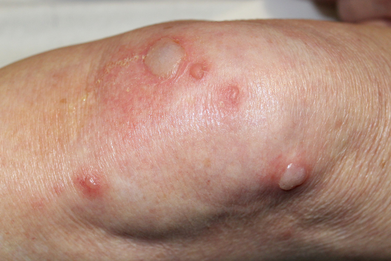Honorine, 76 ans, s’est fait piquer par plusieurs araignées au niveau du genou gauche il y a 48 heures. Depuis, des phlyctènes aux pourtours très inflammatoires sont apparues ainsi qu’une sensation de chaleur.