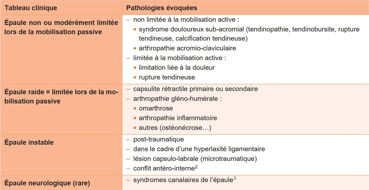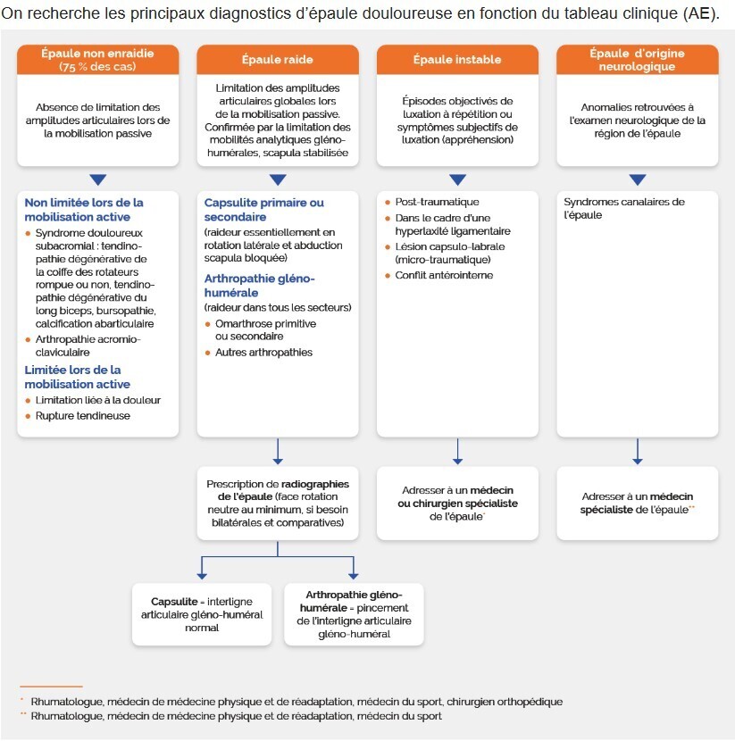 Après avoir éliminé les diagnostics différentiels (tumeur de l’épaule, névralgie cervico-brachiale C5 ou C6, tableau 2), on recherche les principaux diagnostics en fonction de la clinique : limitation lors de la mobilisation passive et/ou active, épaules raides ou instables ou douleur d’origine neurologique (tableau 3 et conduite à tenir dans l’arbre décisionnel en figure 1).