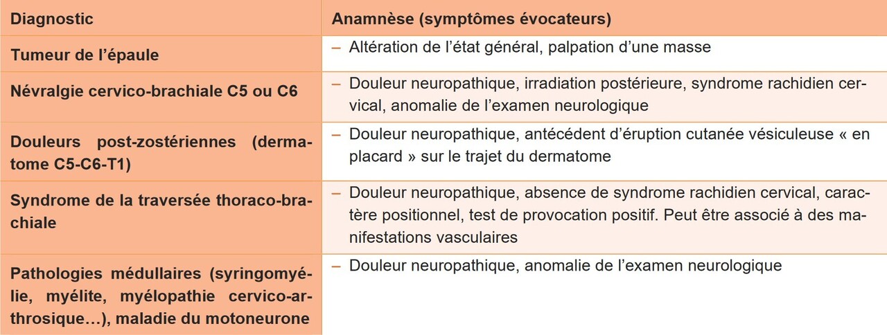 - douleurs localisées en regard du moignon de l’épaule et pouvant irradier dans le bras (celles en regard de la scapula sont plus en faveur d’une origine rachidienne) ;