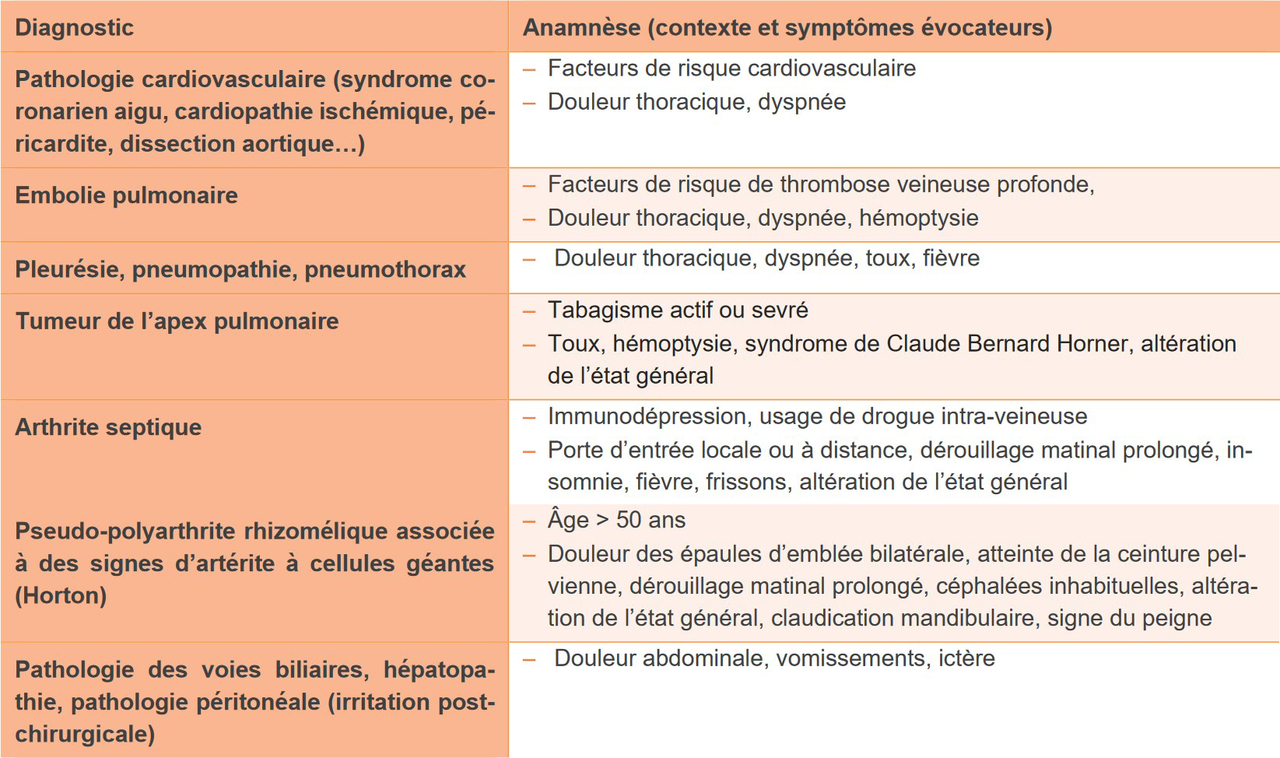 Il est également indispensable de rechercher les diagnostics urgents : pathologie CV, embolie pulmonaire, arthrite septique, pneumopathie… (tableau 1).