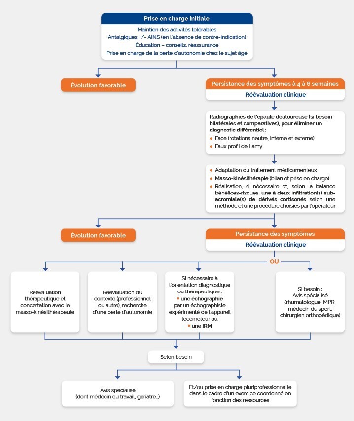 - La prise en charge associe traitement médicamenteux (antalgiques, AINS, injections de dérivés cortisonés dans l’épaule) et non (kinésithérapie, éducation et conseils de prévention), prescrit en plusieurs étapes, selon l’évolution des symptômes.