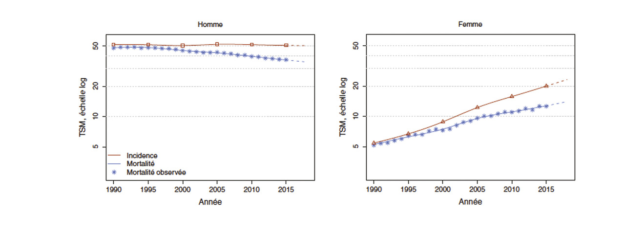Entre 1990 et 2018, en ce qui concerne la mortalité, on note une diminution chez l’homme de -1,2 % par an. L’évolution de la mortalité chez la femme est assez superposable à ce que l’on observe avec l’incidence. En effet, on note une augmentation de la mortalité chez la femme de 3,5 % par an entre 1990 et 2018.
