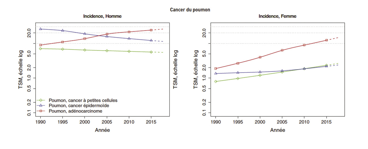 La répartition des cas de cancer du poumon en fonction du type histologique a considérablement évolué depuis les années 1990. Cette évolution est très différente en fonction des sexes. En effet, dans la période 1990-1994, le cancer épidermoïde était prédominant chez l’homme, avec 51,5 % des cas (vs 17,2 % pour l’adénocarcinome et 14 % pour le cancer à petites cellules). Depuis 2010, l’adénocarcinome est devenu le type histologique majoritaire, avec 42,1 % des cas (vs 26,7 % pour le carcinome épidermoïde, et 11,3 % pour le cancer à petites cellules). Chez la femme, la répartition histologique est toujours identique, même si les taux d’incidence augmentent pour les trois types : adénocarcinome +7,7 %, épidermoïde +2,1 %, et cancer à petites cellules +4,4 %. Toutes ces différences sont en partie liées aux différences de comportement tabagique.
