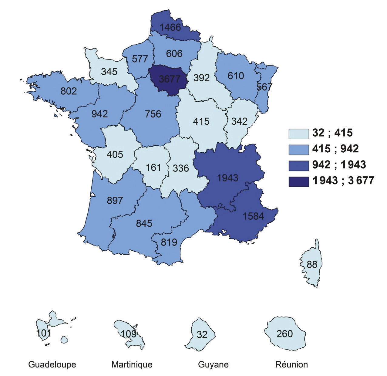 L’accès récent aux bases de données médico-administratives permet maintenant une « photographie » de la prévalence et de l’incidence du diabète sur le territoire national. Ces données ont permis d’estimer que la prévalence du diabète était de l’ordre de 1,3 pour 1 000 jeunes de moins de 20 ans en 2013.6 Les effectifs régionaux sont indiqués dans la figure 2, le total étant de 19 127 (France entière, régime général). En ce qui concerne l’incidence annuelle,7 elle était de 18 pour 100 000 jeunes de moins de 15 ans (entre 2013 et 2015, France entière, tous régimes), avec un ratio garçon/fille de 1,13. Les enfants de moins de 5 ans, de 5 à 9 ans, et de 10 à 14 ans représentaient respectivement 22 %, 36 %, et 42 % des nouveaux cas de diabète avant 15 ans.