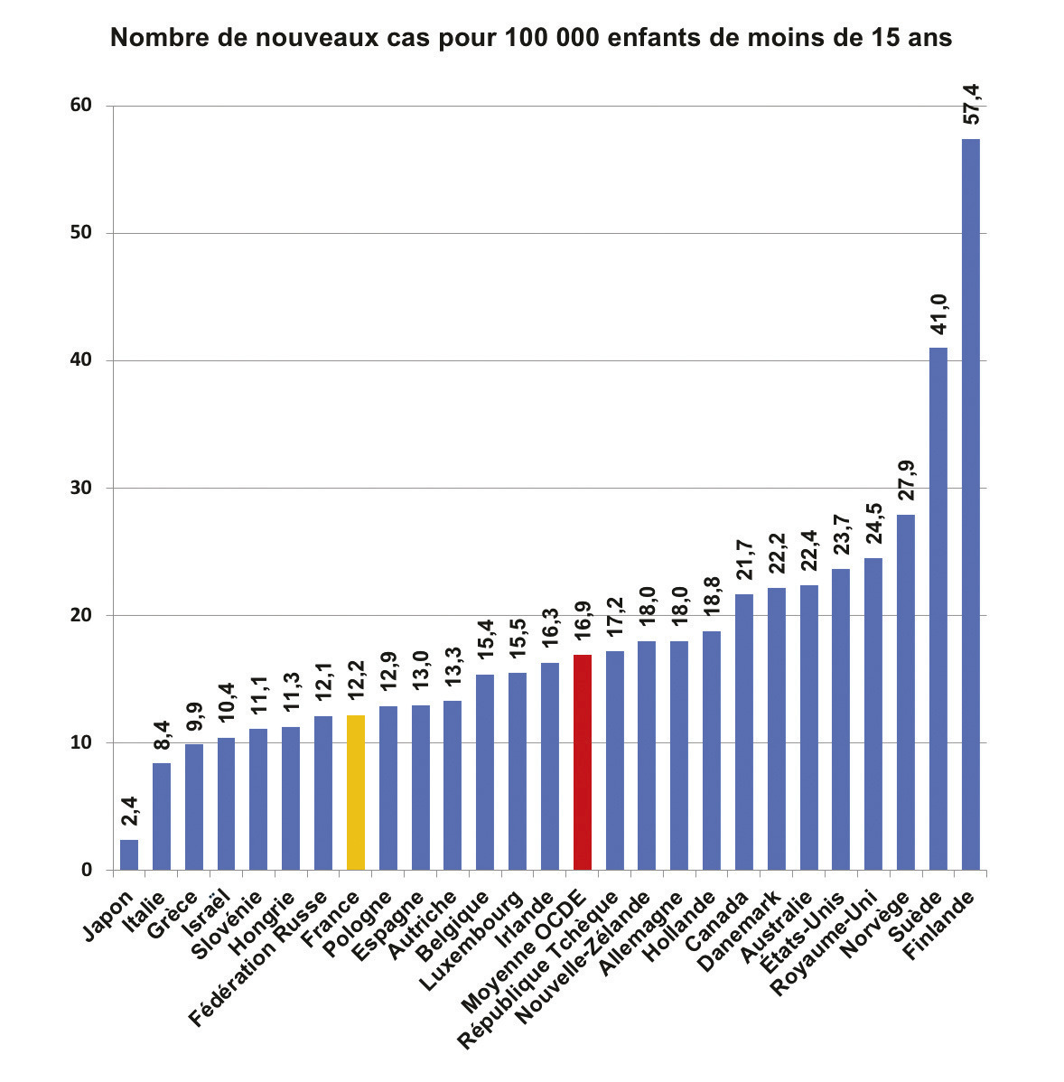Il existe d’importantes variations géographiques concernant les taux d’incidence du diabète de type 1 chez l’enfant (fig. 1).1, 2 Les pays européens obéissent globalement à un gradient nord-sud et ouest-est : les taux d’incidence du diabète de type 1 sont élevés dans le nord et le nord-ouest de l’Europe et bas en Europe centrale, de l’Est et du Sud. Selon les résultats de l’étude Eurodiab, l’incidence annuelle du diabète de type 1 était maximale en Finlande, et une des plus faibles en Italie.3 Certains pays ne s’inscrivaient cependant pas dans ce gradient : le taux d’incidence de la Sardaigne (37,8 pour 100 000) était bien plus élevé que celui de l’Italie, possiblement en raison d’un isolat de population ayant une prédisposition génétique accrue.3 Enfin, la variation d’incidence annuelle a montré que dans certains pays (dont la France), on observait une augmentation d’incidence assez forte chaque année (> 2 %), alors que dans d’autres pays (comme l’Espagne ou la Norvège), cette incidence était stabilisée.3