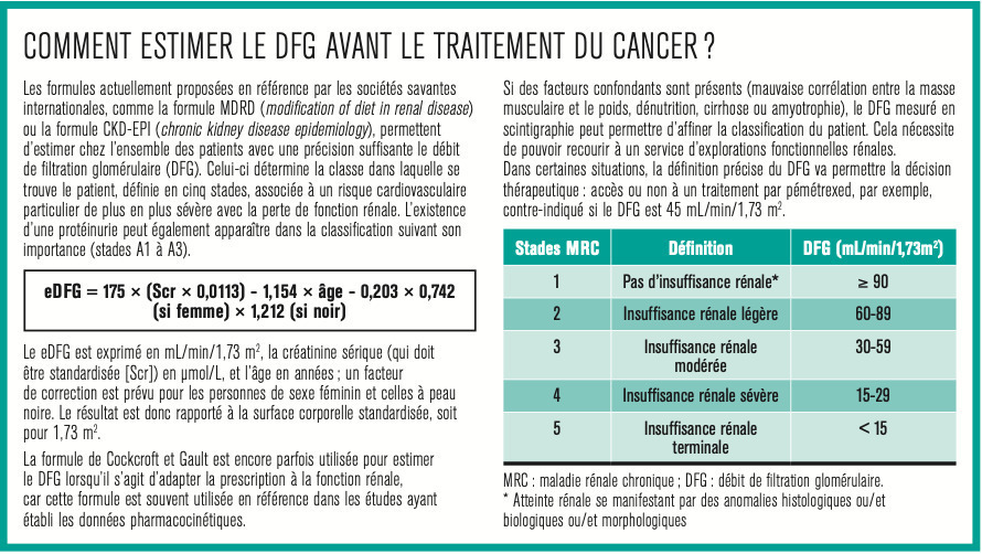 Dans le contexte de la chimiothérapie du cancer, une maladie rénale chronique préalable peut être à l’origine d’un surdosage ou d’un risque de toxicité médicamenteuse. Il convient donc en première intention d’évaluer précisément le débit de filtration glomérulaire (DFG) du patient (encadré ) et de porter une attention particulière à l’adaptation éventuelle des doses thérapeutiques proposées.