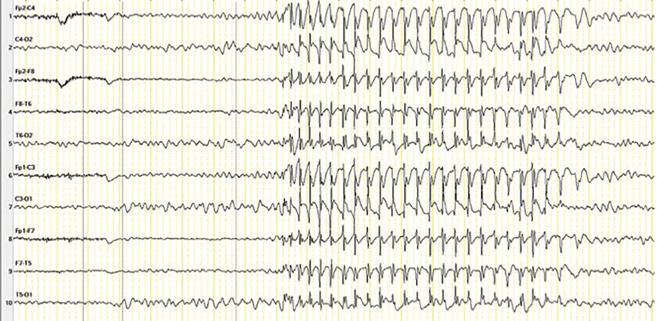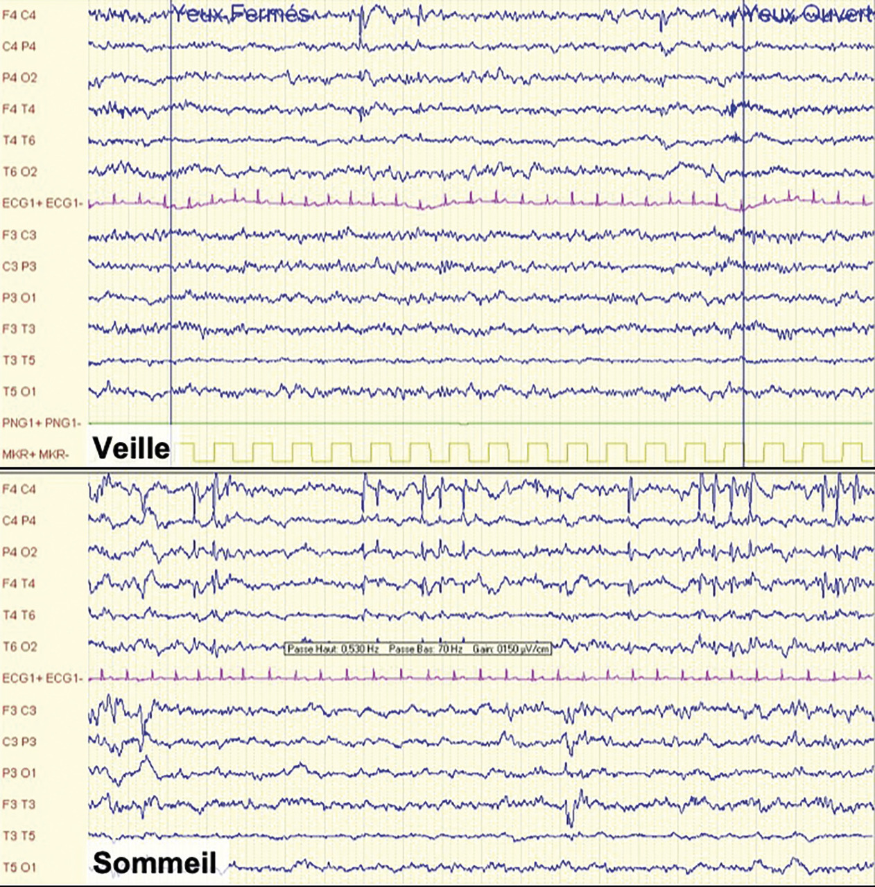 Il est rare d’enregistrer une crise, mais l’enregistrement de l’électroencéphalogramme (EEG) entre les crises (intercritique) associé à l’histoire clinique permet le diagnostic. Sur le tracé, on note des pointes biphasiques isolées ou groupées en bouffées dans les régions centro-temporales, d’un ou des deux côtés, accentuées par le sommeil (fig. 2 ). L’imagerie cérébrale n’est pas indiquée et est normale.