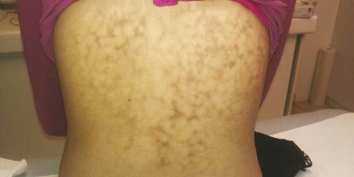 Cette jeune femme de 22 ans consultait pour des lésions dans le dos apparues il y a quelques mois. Bleutées au début, elles étaient devenues de couleur marron. À l’examen, les lésions étaient maculaires, réticulées. Ces lésions n’étaient ni douloureuses, ni prurigineuses, ni desquamantes. L’interrogatoire notait que la patiente restait toujours placée devant un radiateur. Le diagnostic de dermite ab igne était alors évoqué. Après l’arrêt de l’exposition à la chaleur, les lésions disparaissaient.