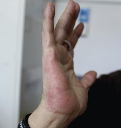 Martine, 65 ans, a depuis plusieurs années un érythème palmaire. Devenue récemment sans-abri, elle s’alcoolise régulièrement.