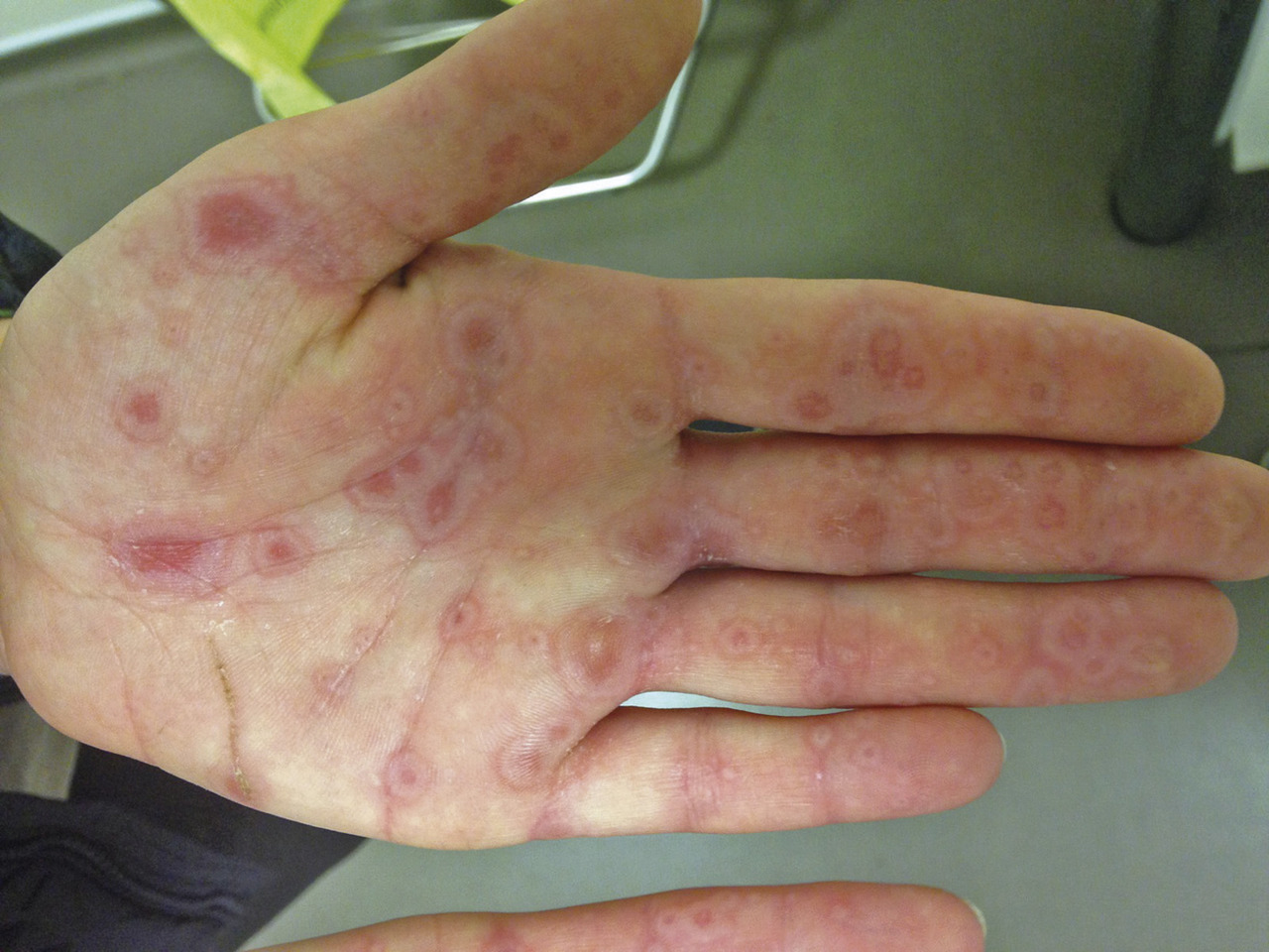 La lésion élémentaire est une papule érythémateusecentrée par une vésicule et entourée d’un halo érythémateux, ayant un aspect typique en cible ou en cocarde. L’éruption touche les extrémités de façon symétrique et évolue par poussées.