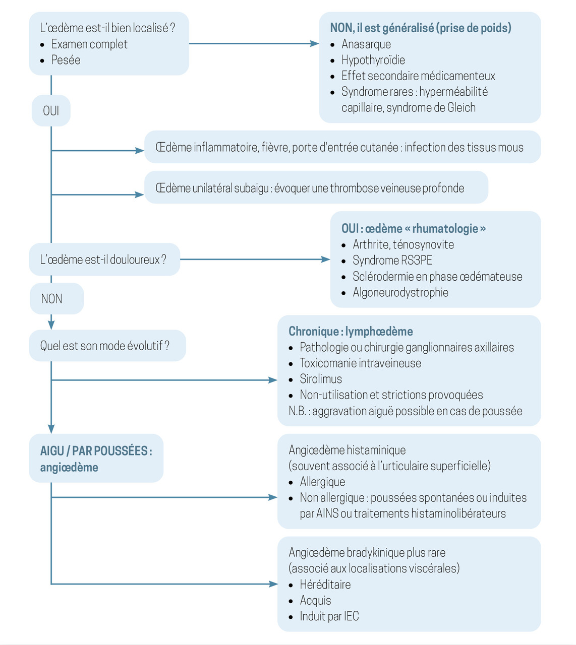 Enfin, l’œdème évoluant par poussées, avec intervalles libres de symptômes, est un angioœdème histaminique (allergique ou non) ou bradykinique (œdème angioneurotique). Ce dernier est associé à des douleurs abdominales (ascite). Le lymphœdème peut évoluer par poussées, mais il y a un fond permanent.