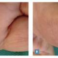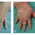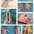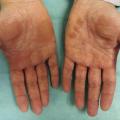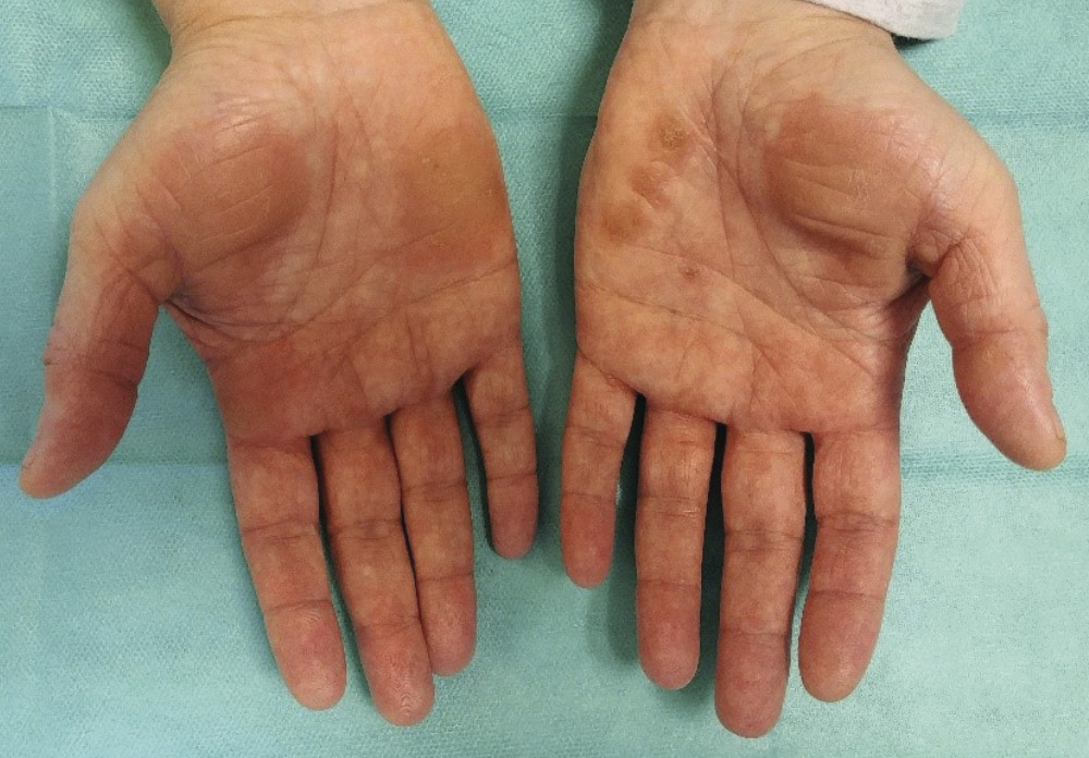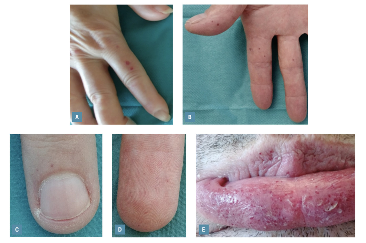 Il donne un aspect très particulier aux paumes : une kératose fissuraire prédomine aux bords latéraux des premiers doigts (« mains de mécanicien »). S’y associent souvent des arthralgies, un phénomène de Raynaud, des signes respiratoires et des signes généraux (fièvre et syndrome inflammatoire).