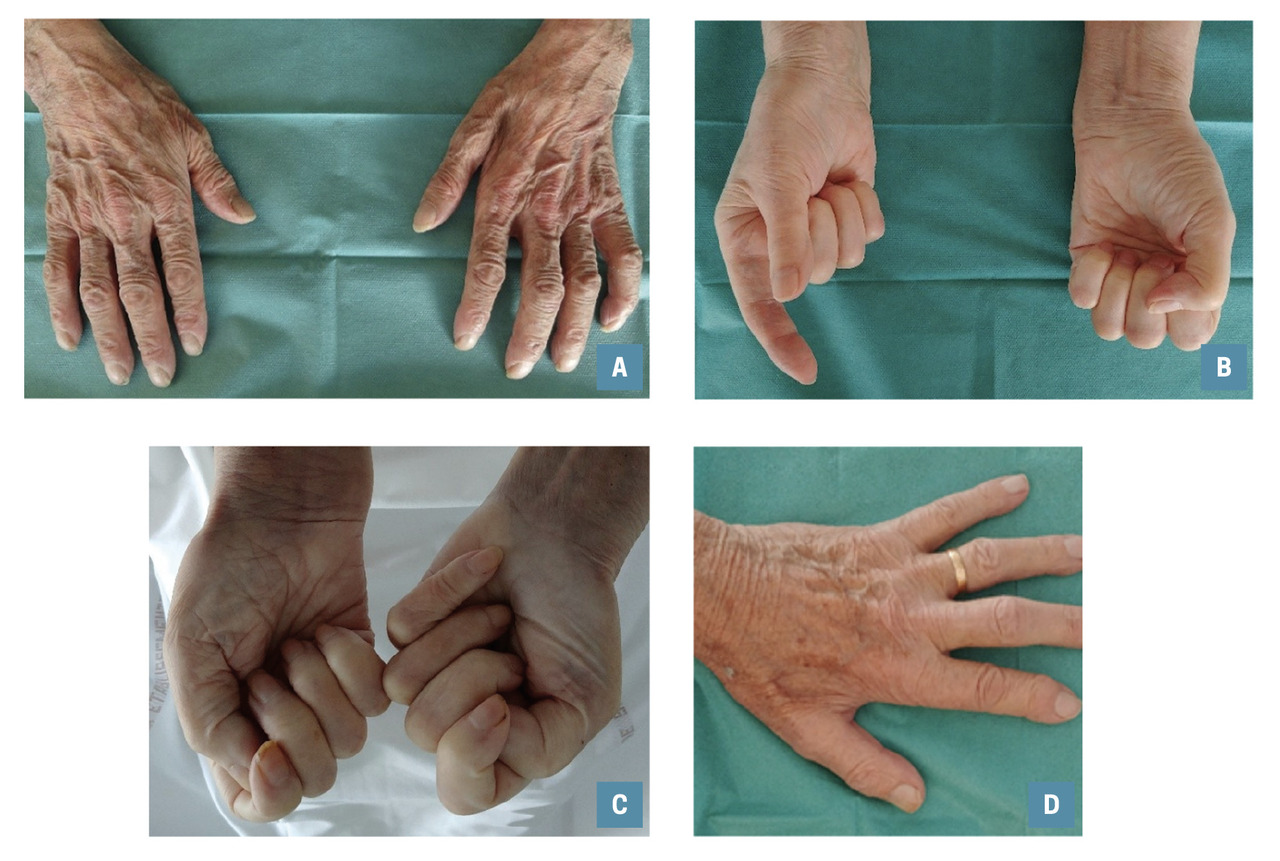 Les syndromes canalaires associés sont le plus souvent en cause. La main prend un aspect particulier, en « main d’Aran-Duchenne », associant les atteintes motrices des nerfs médian et ulnaire (