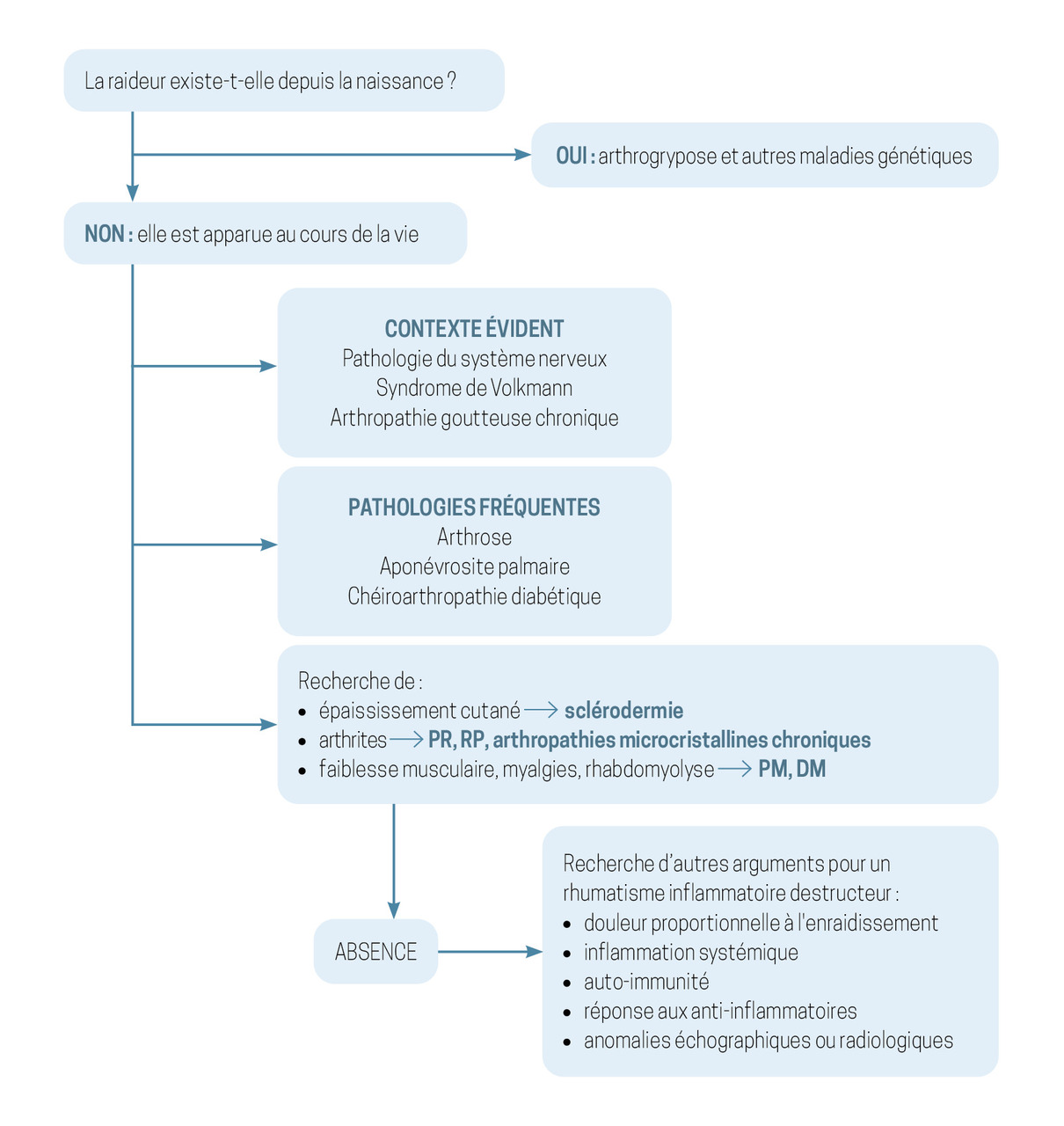 Une proposition de démarche diagnostique devant un enraidissement articulaire est résumée dans la