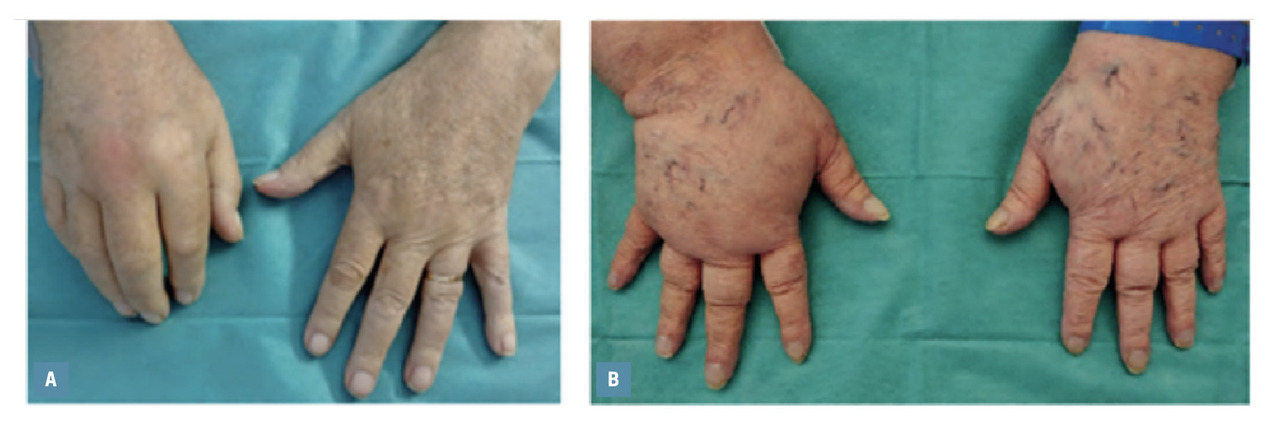 L’algoneurodystrophie et le syndrome RS3PE (polyarthrite œdémateuse ou remitting symmetrical seronegative synovitis with pitting edema) sont des affections particulièrement génératrices d’œdème au niveau des mains. Autrefois défini comme une pathologie à part entière, le RS3PE est aujourd’hui considéré comme un syndrome secondaire à une pathologie (pseudopolyarthrite rhizomélique [PPR], rhumatismes inflammatoires auto-immuns, arthropathies microcristallines, cancers, etc.) [