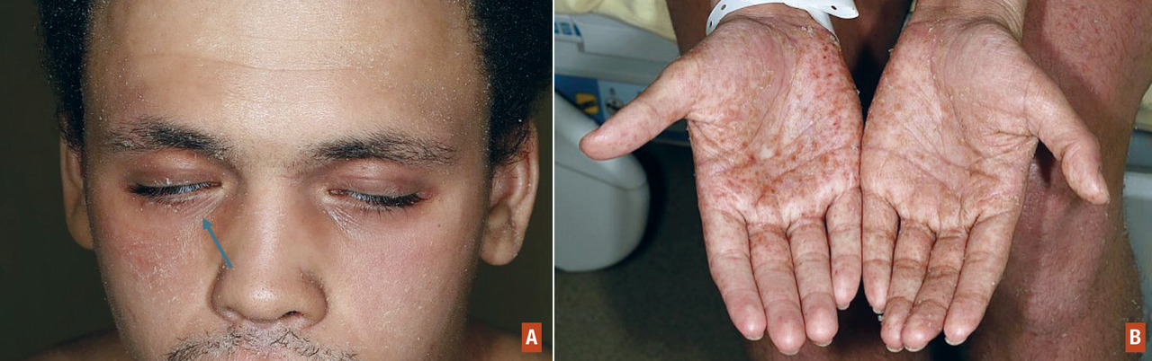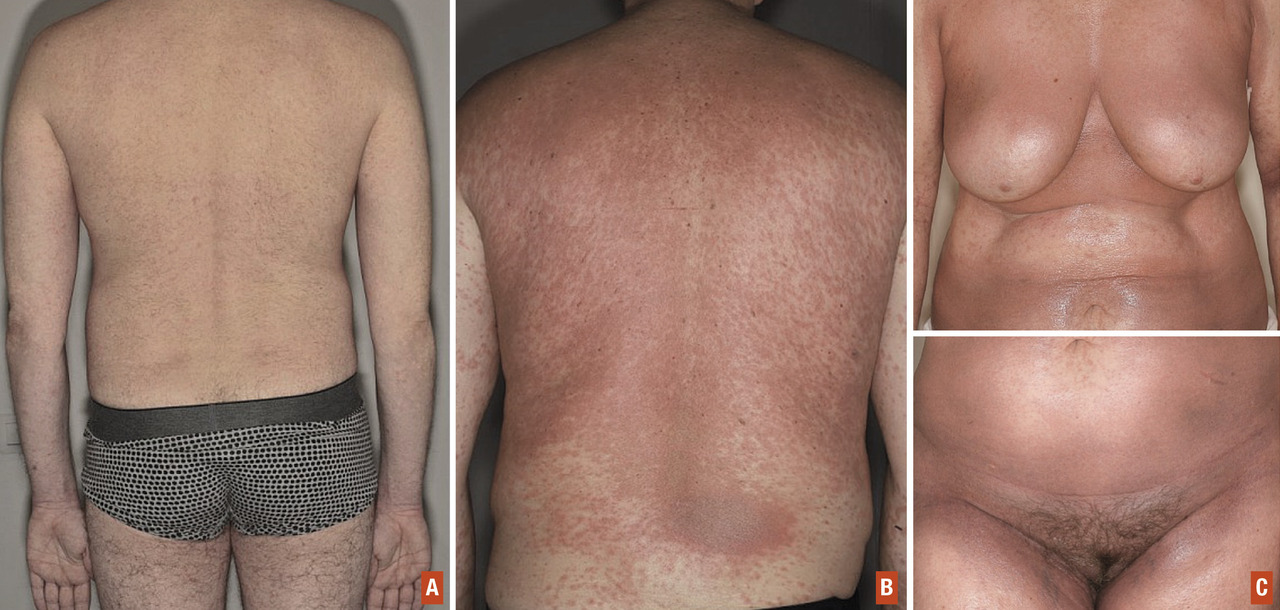 On distingue trois types de présentation clinique qui orientent le diagnostic chez l’adulte : exanthème roséoliforme, morbilliforme et scarlatiniforme (Devant un exanthème, il convient d’estimer la surface corporelle atteinte, sa localisation, et de rechercher les signes généraux (fièvre, altération de l’état général). La présence de signes extracutanés oriente le diagnostic : origine virale (fièvre, syndrome grippal, énanthème, polyadénopathie) et origine médicamenteuse (prurit, caractère polymorphe de l’éruption). Les signes de gravité indispensables à rechercher sont : l’œdème du visage, les adénopathies, la présence d’un signe de Nikolsky (décollement cutané provoqué par le frottement en peau saine) et les érosions muqueuses, qui orientent vers une toxidermie grave.