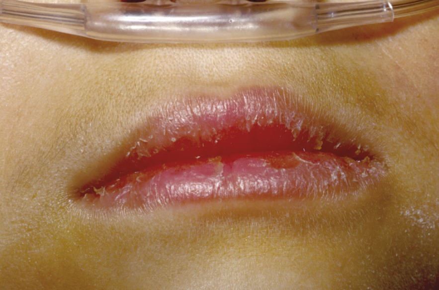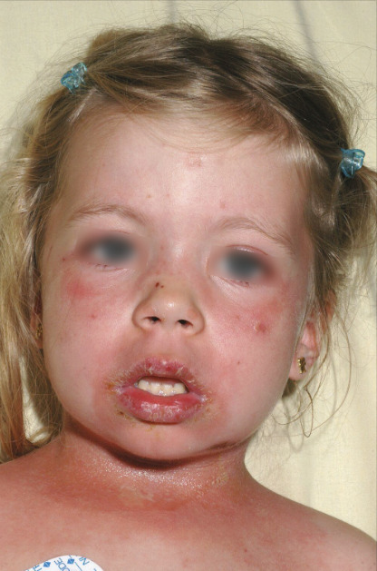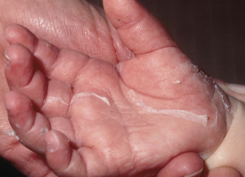 L’exanthème survient trois jours après le début de l’infection. Il est accompagné d’une altération de l’état général et de douleurs cutanées. L’atteinte prédomine initialement au niveau des grands plis et dans les régions péri-orificielles (fig. 8 et 9). Le clivage est intra-épidermique, le signe de Nikolsky (décollement cutané lors d’une friction de la peau saine) est donc positif (fig. 10), et les bulles sont flasques.