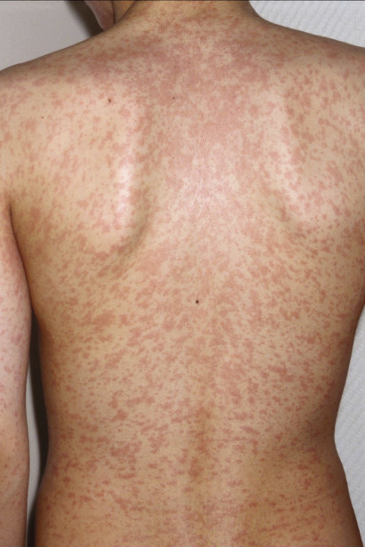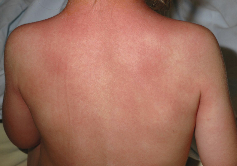 On différencie trois types d’exanthème : morbilliforme, roséoliforme et scarlatiniforme.