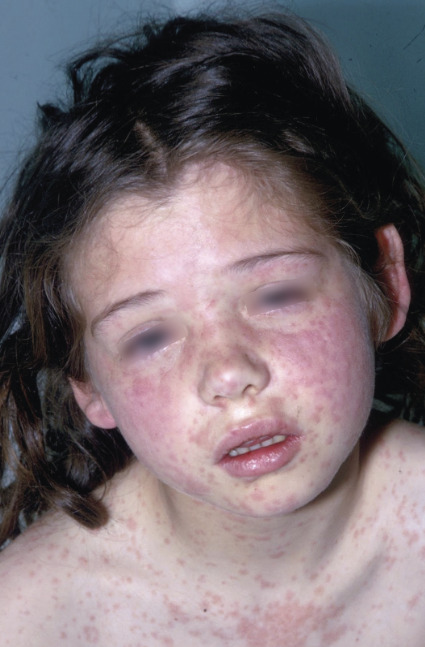 Elle débute par la triade des 3C : cough (toux), coryza (rhinite) et conjonctivite. Cette triade s’associe à une fièvre élevée et à un énanthème pathognomonique mais fugace (« signe de Köplik ») qui est constitué de papules blanchâtres sur fond érythémateux au niveau de la muqueuse jugale. L’éruption cutanée se manifeste en moyenne deux à quatre jours après le début des signes généraux, d’abord en rétro-auriculaire, à la lisière des cheveux et au niveau du front avec une diffusion crânio-­caudale (fig. 4). Le signe de Köplik disparaît dans les quarante-huit premières heures de l’exanthème. L’éruption s’amende cinq jours plus tard, dans l’ordre d’apparition.